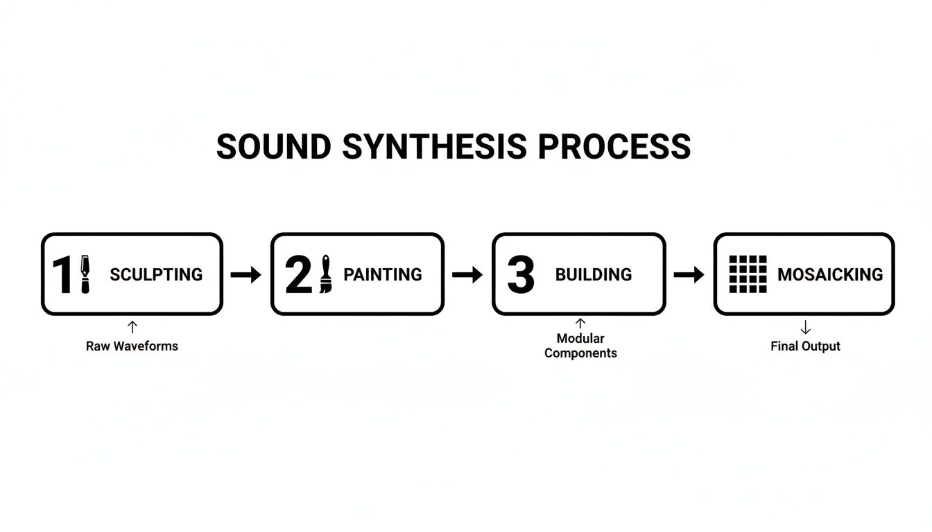 Instead of getting bogged down in the heavy math, the best way to grasp these concepts is through some simple analogies. We can imagine the process as sculpting, painting, building, or even creating a mosaic. Each technique takes a basic material and transforms it into something expressive and recognizable. Let's dig into the four main methods that power most of the procedural audio you hear today.